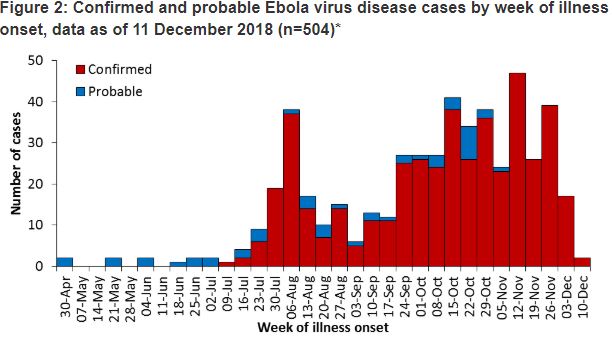 - Figure 2: Confirmed and probable Ebola virus disease cases by week of illness onset, data as of 11 December 2018 (n=504)*